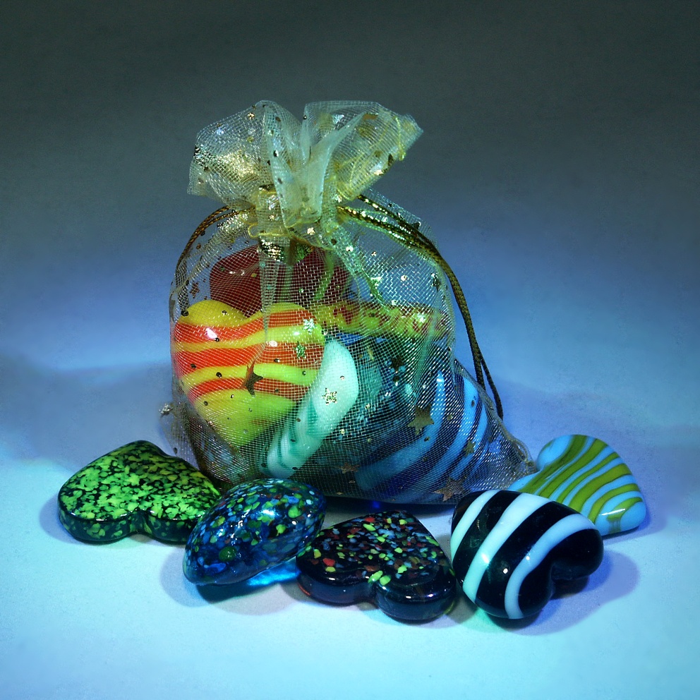 Směs deseti ručně vyráběných srdíček v dárkovém pytlíčku. Každý kus je originál.